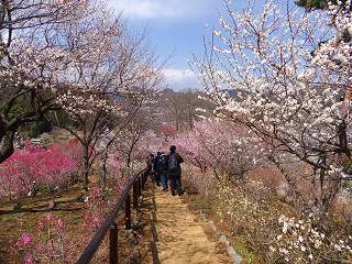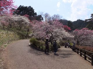 園内の遊歩道には 階段の道の他に車椅子で見て回れる道もあって、色とりどりの梅を見な