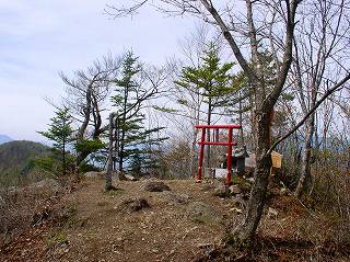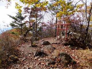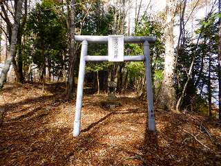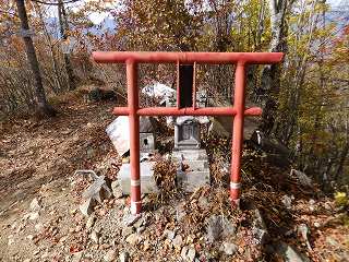 崩落地から20分登って稜線に出ると、右奥に 念力大国神の鳥居と石の祠があります。