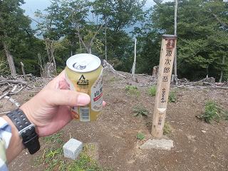 山頂は木に囲まれてますが、かろうじて 標柱の後ろの樹上に甲武信ヶ岳が見えました。