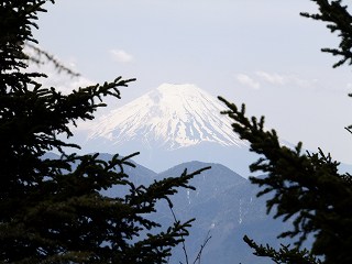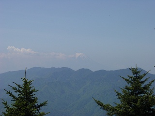 山頂は木に囲まれていますが、南側の樹幹整理された所から 大菩薩嶺と富士山が見え