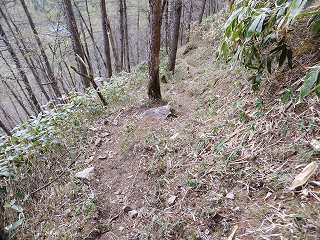 3分登って稜線に出たら シャクナゲの中の登山道を歩きますが、前回登った時は ここの