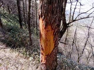 ___(将監峠から先の登山道)___________(鹿に皮を食べられた木)