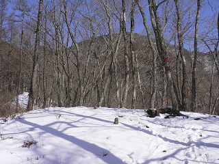 分岐から 南斜面にある傾斜のきつい登山道を15分登ると、カラマツ林の奥に 今倉山の