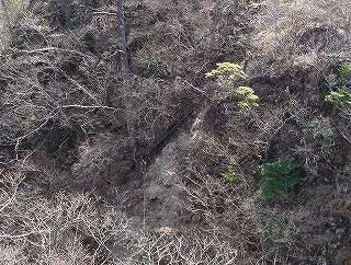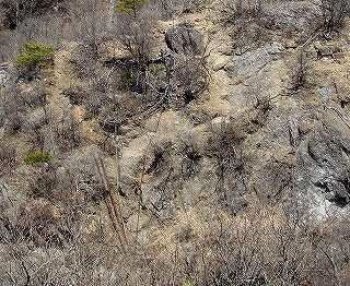 (金山側の斜面、左下にハシゴが見える)__(十二ヶ岳側の斜面、画像の中央がロープ場)