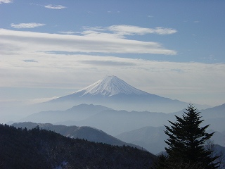 東側にある丹沢山は雲に隠れていて、南側に富士山の山頂が見えて、西の樹間に 北岳と