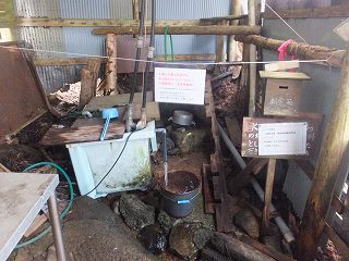 山小屋の中はそれほど広くなくて、奥に 100円で利用できる水場があります。