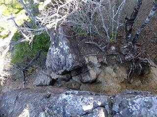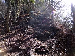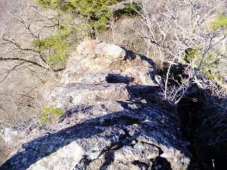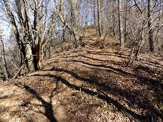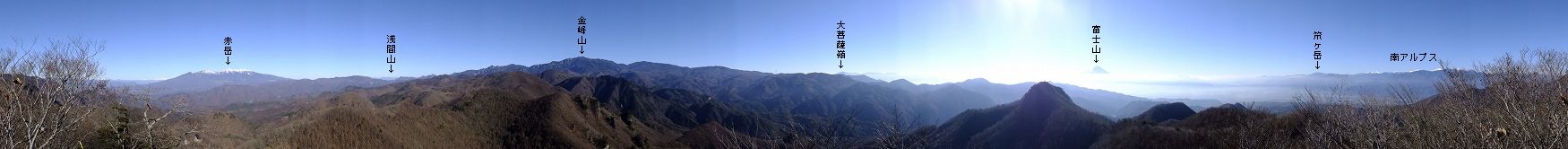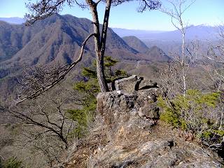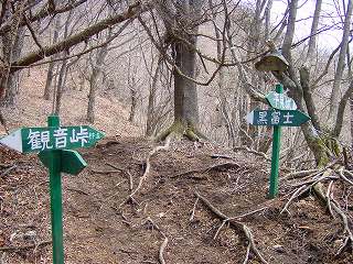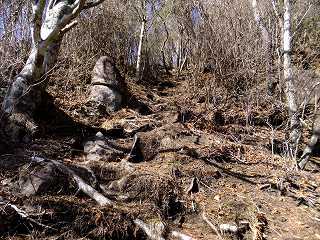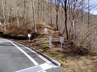清川バス停から直進して 太刀岡山を右に見ながら登って行くと、観音峠にあるNTTのアンテナ の先に曲岳登山口があって、その向かいに 5〜6台の駐車スペースがあります。 ※ 2002年は ここから黒富士まで縦走して、帰りは 黒富士登山口から車道を歩ききましたが、 登山靴での長い車道歩きは きつかった。 ![]() ____(中央道から見た2座)___________(観音峠の駐車スペース) 2012年は 観音峠の2.5キロ先にある黒富士登山口から登って、八丁峠から黒富士と曲岳の ピストンをしました。 ![]() ___(黒富士登山口の入り口)_______(駐車場の右奥に堰堤が見える、2002年) ※ レポは2002年のものですが、画像は2012年に撮影したものです。 登山口から いきなりの急登の登山道なので ペースを落として登りました。 ![]() _____(曲岳登山口)_____________(登山口付近の登山道) 急登を20分登った所にある「めまい岩」で 巨岩の間にある隙間を通ります。 ここを通過するには ある程度の腕力が必要で、力に自信の無い人は 岩の下を回って 雑木林の中を藪こぎすれば迂回できるようです。 ![]() _(めまい岩の上から見た狭い通路)________(隙間の先を下りるロープ場) めまい岩の突端にある展望ブリッジは狭いので チョッとした高度感を味わえます。 ![]() ___(めまい岩の展望ブリッジ)____________(突端にある展望台) 展望台からは 南アルプスを背にした茅ヶ岳と金ヶ岳の存在が大きくて、右奥に 北アルプスの 乗鞍岳・ 焼岳・ 穂高岳と八ヶ岳が見えました。 ![]() _____(茅ヶ岳と金ヶ岳)______________(北アルプスと八ヶ岳) めまい岩から上も 胸突き八丁の登山道が続きます。 ![]() ___(胸突き八丁の登山道)______________(登山道にある道標) 観音峠から傾斜のきつい登山道を35分登って 曲岳の山頂に着きました。 (曲岳の山頂)この時期は落葉しているので 梢の間に多少の景色が見えましたが、葉が生い茂る頃には 山頂からは ほとんど見えないと思います。 ![]() ______(曲岳の山頂)___________(三角点に乗ったプレミアムモルツ) (2002年の山頂)山頂の北側の木の枝が少し低くなった所から浅間山が見えて・・ (山頂から見えた浅間山)山頂から東に下りた所にある展望台から富士山が見えました。 ![]() ___(山頂の下にある展望台)___________(展望台から見た富士山) 展望台から八丁峠に下りると、すぐに 垂直に近い急斜面があります。 ![]() ____(上から見た急斜面)____________(下から見上げた急斜面) 5分ほど急斜面を下りたら、そこから小さなアップダウンを2〜3回越えて(山頂から25分) 八丁峠に着きました。 ![]() ___(急斜面の下の登山道)___________(八丁峠に立つ道標、2002年) ここから黒富士登山口に下りることもできますが、1座では時間が短すぎるので 隣にある 升形山と山梨百名山の黒富士に登ることを勧めます。 _________(升形山で撮影した動画をこちらで見られます) 2012年は、下山後に 駐車場で焼肉をしましたが、私は車の運転をするので ノンアルコール ビールだけで ワインは飲めませんでした。 (ワインと焼肉)