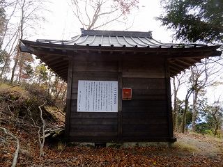 山梨百名山の標柱は本堂の上に立ってますが、山頂は雑木林に囲まれているので景色は