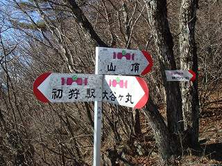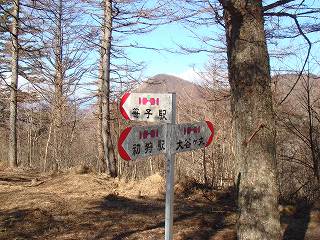 ___(防火帯の中を歩く登山道)__________(稜線の分岐に立つ道標)