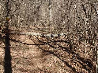 __(登山道に倒れこんだカラマツ)_______(カラマツ林に作られた防火帯)
