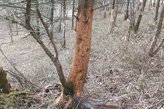 (鹿に皮を剥がれた木)