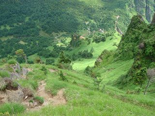 トーミの頭から見下ろした草すべりは 上から見ても凄い傾斜で、よくも こんな所に登山道を
