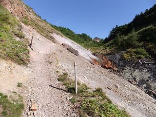 登山道の所々で 硫化水素の臭いがするようになって、硫黄の影響で植物が生えてなく