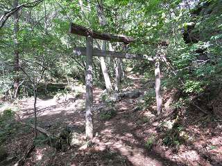 傾斜のゆるい登山道を30分ほど歩いた所に 一の鳥居があります。