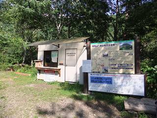 浅間山荘の横に キレイに掃除されたトイレがあって、その隣に 登山道の案内板と登山者
