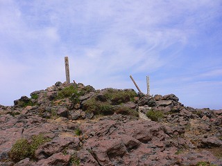 ____(東峰から見た高岳)___________(最高地点の高岳に立つ標柱)