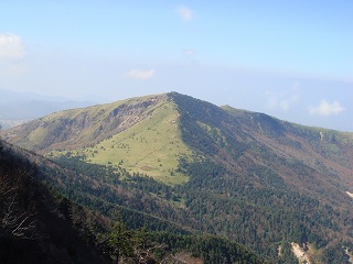 木道の階段を登った所から四阿山の2つのピークが見えて、最初のピークの手前にある