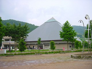 大きな公園内に ピラミッドのような外観をしたスポーツ施設 ユピオがあります。