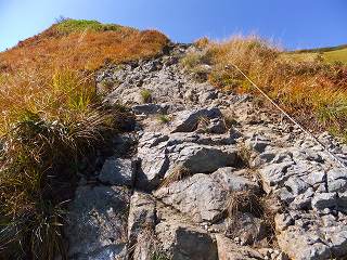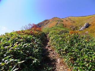 駒の小屋から山頂に向けて、再び 傾斜のきつい登山道を登ります。