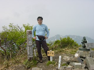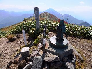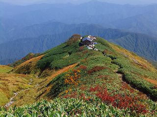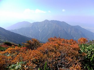 山頂からは 東に奥只見湖が見え、その右奥のなだらかな稜線が会津駒ヶ岳、その手前に