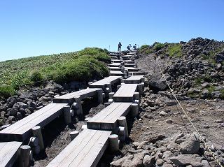 下山は 山頂から八合目に下りましたが、こちらの登山道は 傾斜が緩いうえに木道や