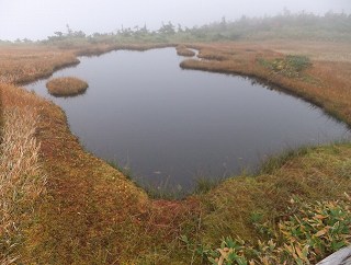 山頂台地の分岐から草紅葉の中の木道を歩いて行くと 大きな地塘がありました。