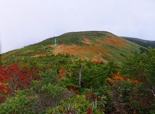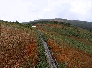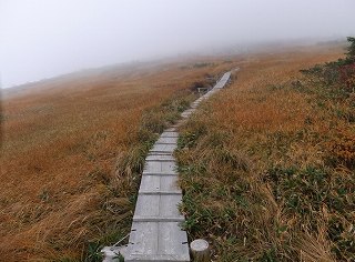分岐から15分登って 草紅葉の中を貫く 長い木道を登った所が山頂です。