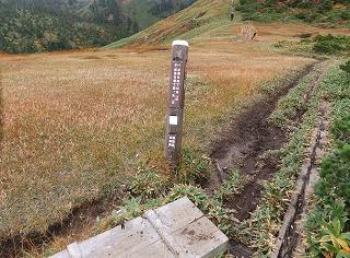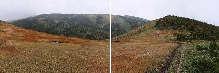 山頂台地の分岐の周りには 地塘が点在する草原が広がっていて、分岐の南に 平ヶ岳の