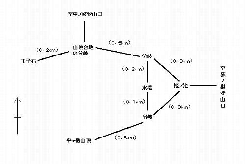 ※ 上の画像は分岐から南を撮影したものですが、北を上にしてみた場合の平ヶ岳山頂の