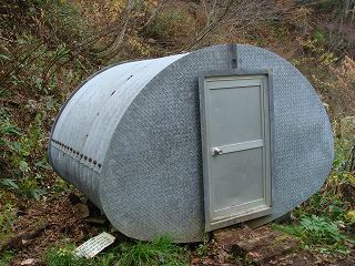 避難小屋の案内から急斜面を下りた所にカマボコ型の避難小屋がありましたが、床の