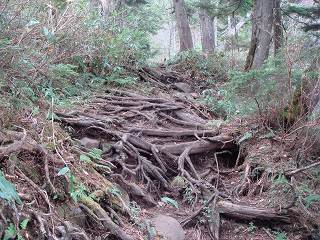 ロープ場から さらに傾斜がきつくなって、高度を上げるにつれて 木の根が多くなって荒れて