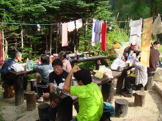 _(テーブルで会話を楽しむ人たち)_____(ハイカー用と山小屋用に分かれた水場)