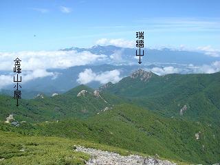 山頂の手前にあるピークからは 北斜面に金峰山小屋が見えて、礫地に「土砂流出防止の