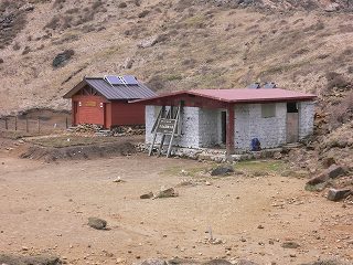 建てられたばかりの避難小屋のトイレは、屋根にソーラーパネルが設置されていて 横の