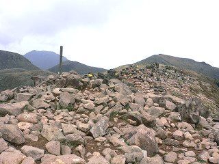 避難小屋の先で2〜3分の岩場を登った所が中岳の山頂で、狭い山頂にある岩の上は