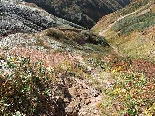 沢の水が完全に消えると 胸を突くような急斜面になって、最上部の斜面では 浮石の多い