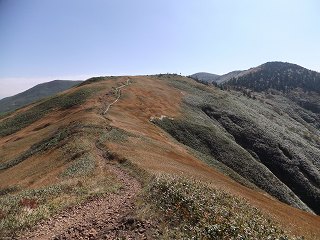 (稜線の分岐から巻機山に行く登山道)____(振り返って見た登山道、奥が割引岳)