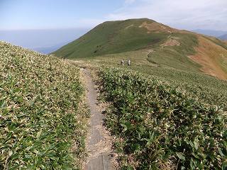 御桟屋から牛ヶ岳まで 笹原と草原の中に作られた木道を歩きますが、この美しい稜線は