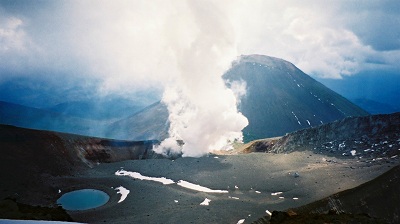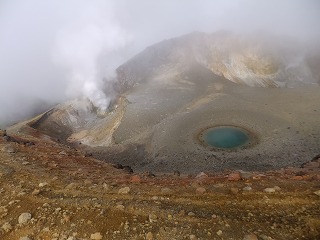 (青沼と噴煙、後ろは阿寒富士)