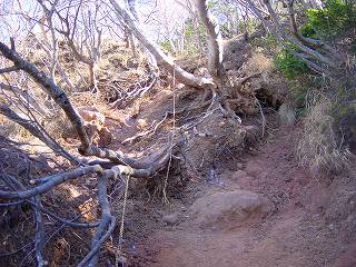 (トラロープが下がる ザレた登山道)