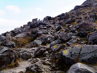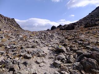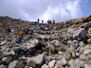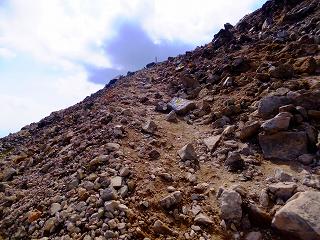 ガレた登山道の上に 石が散乱している所があって、ここを登りきれば山頂は近い。