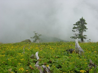 斜面に広がるお花畑が素晴らしく、(この日は景色が見えませんでしたが)ガレ場コースと