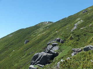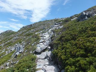 ここから見上げると 左に北カールの稜線が見えて、登山道の上に 大岩が見えました。