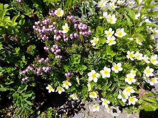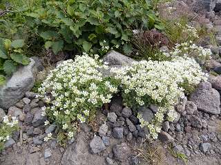 (植生保護のロープが張られた登山道)_________(チシマクモマグサ)