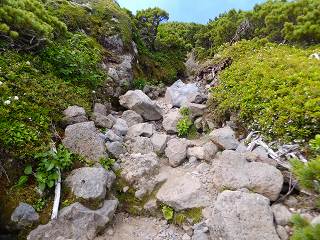 __(ハイマツ帯の中の登山道)________(背の低いダケカンバの中の登山道)