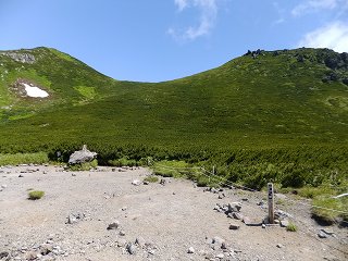 雪渓の上で傾斜の緩い登山道を登ると その先が羅臼平です。