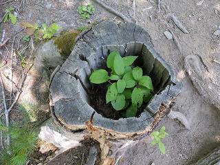 (この辺りの林床に密生していたシャクナゲ)____(切り株の中に生えた若木)
