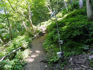 登山口から エゾマツと思われる林の中の傾斜のきつい登山道を登ります。