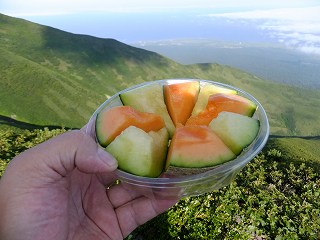 _(第二見晴台から見た利尻町方面)______(第二見晴台で食べたカットメロン)