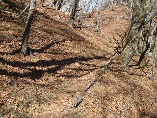 ブナ平から林床に笹が多くなって、再び傾斜がきつくなると ジグザグに作られた登山道を